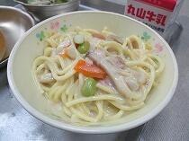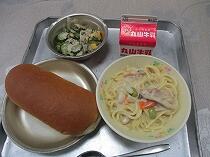 今日の給食は、「ごもくうどん」と「アーモンドサラダ」でした。