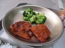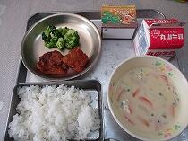 今日の給食は「てりやきチキン」、「ブロッコリー」、「コーンポタージュ」、「チョコレートケーキ」でした。