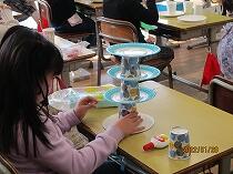 1年生は、図工「かみざらごろごろ」の学習に取り組んでいました。紙皿や紙コップをいろいろ組み合わせて、転がして遊ぶおもちゃを作りました。