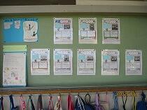 教室後ろの掲示板にも全部の班の作成物が貼ってありました。代表の班の作成物が廊下側の掲示板に貼ってあったのでご紹介します。