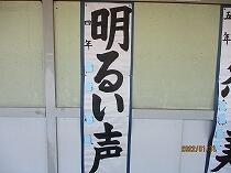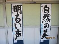 職員室前の廊下の掲示板には、5年生と4年生の条幅の習字が掲示してあります。