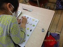 始めに運動所のフィールドで、じゃんけんをして、チョキで勝ったら、チョコレートと言って歩数を進める、よくやる遊びを取り入れて、早く反対側につく競争をしていました。体を温める運動にもなるし、ジャンプをする練習にもなるのでとてもいいなと思いました。何よりもみんな楽しそうでした。