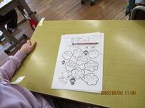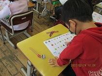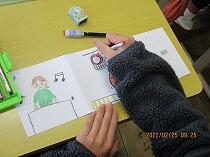 今日のToday goal「三角絵本をつくりましょう」ということを示して、意欲をもたせて説明や質問の仕方をゲーム形式で楽しく学んでいました。最後に、自分の三角絵本を作成する活動に取り組んでいました。