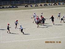 2年生が体育の時間、しっぽとりおにごっこをしていました。エリアを決めて、その中で相手のしっぽを取ります。取られた子どもはエリアの外に出ます。