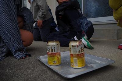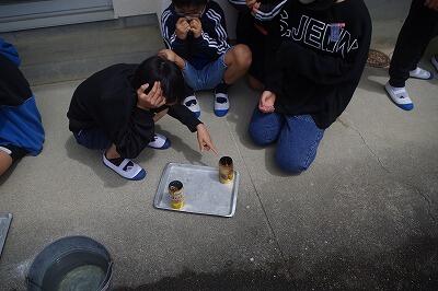 班ごとに、空き缶の上の方に穴をあけたものと、下の方に穴をあけたものの、双方で割り箸と新聞紙を燃やし、どちらがよく燃えるか調べていました。さて、結果は・・・。