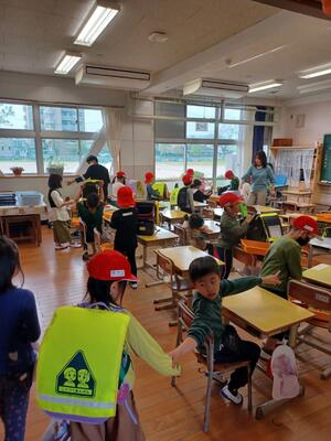 不審者が包丁を持って中庭を徘徊している想定で行いました。特に低学年は緊張の面持ちでしたが、「お・は・し・も・ち」の決まりを守って、速やかに避難できていました。