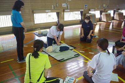 令和5年6月14日(水)、体育館で職員研修として救命救急講習を受講しました。消防本部や消防団の方に4人来ていただいて講義を受けたり、4つの斑に別れて、心肺蘇生法実技研修、AED利用も併せた蘇生法研修を受講したりしました。