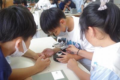 5年生は理科室で、解剖顕微鏡を使って、メダカの卵の観察をしていました。顕微鏡のレンズの位置やピントを合わせるのに苦労していましたが、上手に合わせて観察できていました。