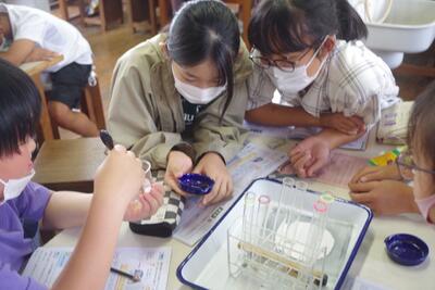 令和5年10月20日(金)、6年生が理科室を暗くしてボールにライトを当て、太陽と月の位置関係による月の満ち欠けの見え方の観察・学習をしていました。なかなか難しいところですが理解できたかな。