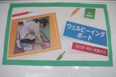 校長先生からは、校長室入り口横に新たに設置した、「ウェルビーイング・ボード」の話がありました。簡単に言うと、子どもたちが自主的にボランティア募集・応募を実施・検討したり、みんなが楽しめるイベントを計画し告知したり、それを見て、お互いに「気付き、考え」たりして、「幸動」を生むための掲示板です。紹介した次の日から、早速、様々な書き込みや、それを見て実際に幸動したりする様子がみられました。それらは追って紹介いたしますね。