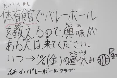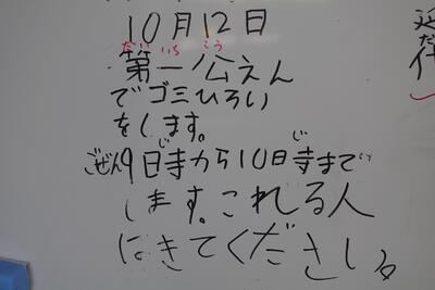 この後、バレーボールを教えるよとか、紙飛行機大会をするよとか、お絵かき教室をするよ、休みの日に第一公園のゴミ拾いをするよなどの企画が、ボードに書かれていました。追って紹介します。