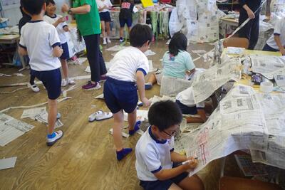 令和5年10月20日(金)、4年生が体育館で新聞紙を使って「1㎡(平方メートル)をできるだけたくさん作ろう」という活動をしていました。このような活動を通して、面積の量感をつけていくのも大事ですね。7枚もつくった班があったようです。