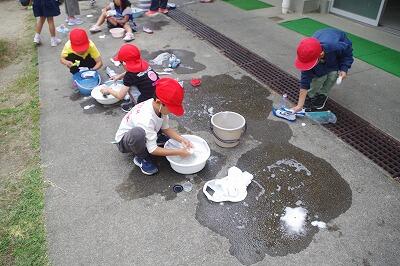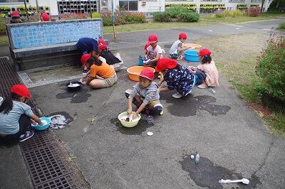 令和5年10月20日(金)、1年生が生活科の学習で、自分のシューズを洗っていました。