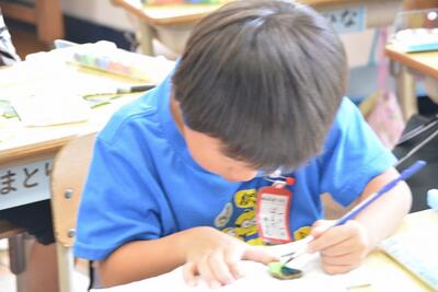 「石や葉っぱの形を考えて絵を描こう」の学習がありました。直接、思い思いに描いていきました。みんな真剣!そして楽しそうに学習していました。