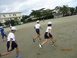 運動場は水たまりで、十分使えませんでしたが、5年生が自分たちでリレーの練習をしていました。