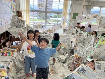 2年生が図工の授業で、教室中に新聞をつないて、新聞をつるして、楽しくお家や基地?などをつくっていました。いい笑顔です!