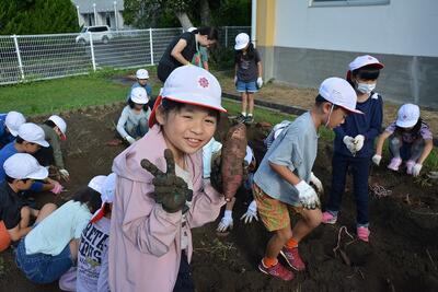 令和6年10月8日(火)、2年生がさつまいも掘りをしていました。今年はマルチを張って苗を植えましたので、草に養分を奪われず、大きなおいもができていました。給食でも提供される予定です。ありがとう2年生!