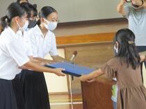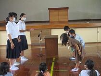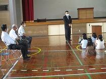 岡富中からは代表3名と校長先生、教頭先生、担当の先生が来校されました。また、延岡市教育委員会の澤野教育長、紙芝居を製本してくださった延岡観光協会の方や延岡アースデーの方、この紙芝居のモデルになった「コノハナロード延岡市民応援隊」の代表の方が来賓として本校に来てくださいました。