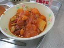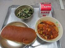 今日の給食は、「チリコンカン」と「こまつなサラダ」でした。