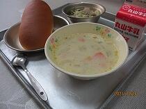 今日の給食は、「ぶたにくのごまみそマヨネーズ」と「ポテトコーンスープ」でした。