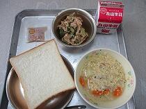 今日の給食は「ふわふわスープ」、「せんぎりだいこんのオーロラサラダ」、「りんごジャム」でした。
