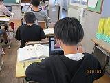 コンピュータを使って、グラフや表を用いて効果をあげている資料を写真に撮り、ロイロノートで、情報を共有したりしています。