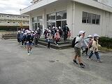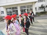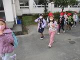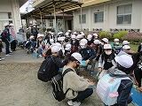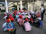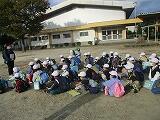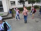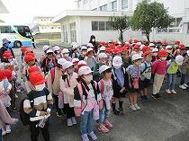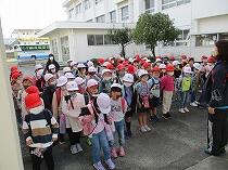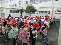 教室ではそれぞれの学級で担任の先生と「遠足のきまり」を確認して、外に出て1年生全体のお話を聞いてから、準備万端整って出発しました。
