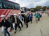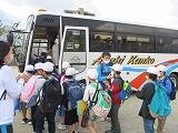 5年生は、中庭に集まって「今日の約束」などを確認してから、バスに乗り込みました。また、バスに乗り込む前に、バスの運転手さんに全体的なあいさつをしていました。