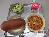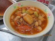 今日は、パンがミルクパンだったので「ポークビーンズ」の酸味と合っていて、おいしかったです。「ポークビーンズ」に入っている大豆は畑の肉と言われるくらい良質のタンパク質がたくさん入っているので、体がどんどん大きく成長する小学生にはとても大切な食材ですね。