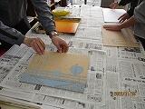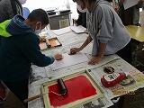 先生と一緒に順番に力を合わせて、協力して作業をしていました。この後は、裏面を使って、近景を黒で印刷するそうです。