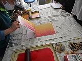 6年生は、空や背景は夕焼けのようなあかね色にして、近くのものを黒にする3色刷をしていました。今日は、背景に黄色や赤のインクで印刷をしていました。