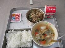 今日の給食は、「ぞうに」と「まだかづけ」でした。ご飯にはふりかけもついていました。