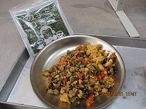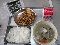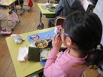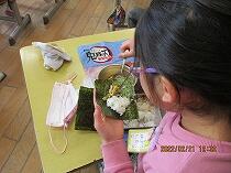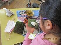 おにぎりは「たかなおにぎり」でした。高菜と炒り卵や挽肉などの具を海苔で巻いて食べました。いつも大きな海苔でしたが、今日は低学年に合わせて小さい海苔4枚にしてみたそうです。海苔にご飯を載せて、そこに具を入れて手巻き寿司のようにして食べていました。