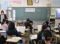 タブレット上の鍵盤を使って、音楽の演奏をしていました。これだと音も出せるし、操作している画面を共有してみんなで確認することもできます。また、楽譜と連動したり、演奏の練習もいろいろ工夫したりすることができそうです。