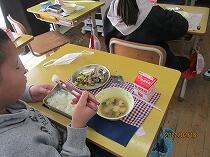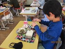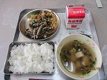 今日の給食は、延岡の名物「めひかりのいそべあげ」と「はちはいじる」、「さんしょくやさいのごまあえ」でした。