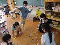 今日、1年生は各学級時間を交代して「めんこ」を使った昔の遊びに挑戦していました。