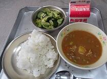 今日の給食は「カレーライス」と「グリーンサラダ」でした。