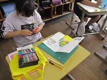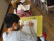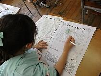 1年生が国語のまとめとして、お世話になった人への感謝状を書いていました。先生が訂正してくれたところを間違えないように清書する子ども、清書したものをきれいにサインペンでなぞる子ども、一生懸命イラストに色を塗る子どもなど様々でした。