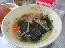 小学生にも大好評で、たくさんお代わりをする子どもたちがいました。ソースの味が効いておいしかったようです。その濃いめの味に、さっぱり味の「わかめスープが」とてもマッチしていました。