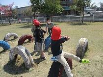 3年生は、いろいろな遊具を使って遊んだり、鬼ごっこをしたりしていました。また、ドッジボールをする子どもたちもいました。春でエネルギーが溢れかえっているような感じでした。