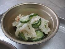 「だいこんサラダ」は、写真のように大根ときゅうりなどの野菜がツナとマヨネーズで和えてありました。大根はしなっとして柔らかく、きゅうりはしゃきしゃきしていて、噛むとおもしろい食感でした。噛んでいるとツナとマヨネーズの味が口の中に広がりおいしかったです。