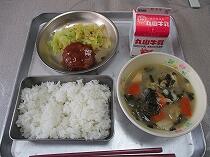 今日の給食は、「てりやきハンバーグ」と「そえやさい」、「たけのこのみそしる」でした。