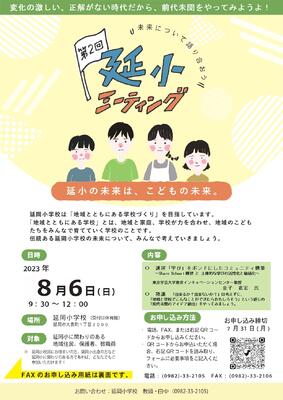 令和5年8月6日(日)の9:30~12:00に「第2回延小ミーティング」を開催します。「可能か不可能かは別として、地域と延小で、こんなことができたらおもしろいぞ」というようなアイデアを楽しく語り合う会にしたいと思っています。保護者、地域の方々、興味のある方々、ぜひ参加してください。