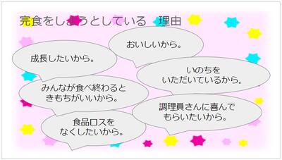始業式終了後は、栄養教諭から1月の生活目標「感謝して食事しよう」に関連したお話がありました。そのとき使用したスライドの中の1枚が下記です。子供たちに給食を完食しようとする理由を聞いたものです。「食品ロスをなくす」とか「調理員さんに喜んでほしい」とか「いのちをいただいているから」など、それぞれ素晴らしい理由が書かれていますね。