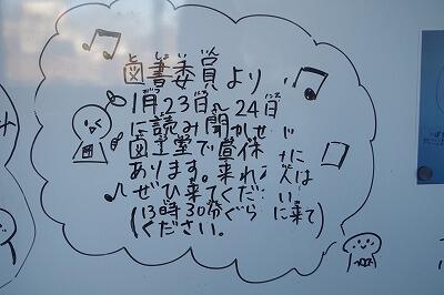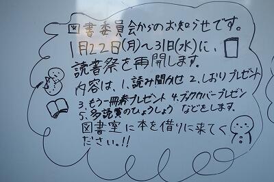 令和6年1月15日(月)、図書委員会の6年生が、「読書祭り」や「読み聞かせ」のお知らせをウェルビボードに書いていました。本当は読書祭りは、11月に計画して少し実施したのですが、インフルエンザの流行で延期していました。再開に向けて、図書委員会の子供たちも張り切っています。これを機会にたくさん読書に親しんでほしいです。