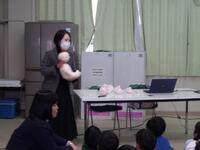 本時のめあては「自分や他の人のいのちを大切にするためにできることを考えよう」です。だから、妊娠してからお腹の中の赤ちゃんがどのように成長していくのかをイラストや映像で見ることや、妊婦さんや回りの家族の思いにふれながら、「いのち」についての学びを深めていきます。きっと自分が産まれたときと重ねながら学習をしたことでしょう。そして、産まれたばかりの赤ちゃんそっくりのダミー人形を一人一人抱っこして、「いのち」の重さを肌で感じます。