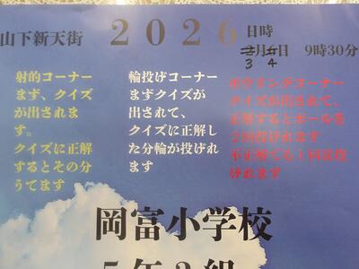 2月6日(金)午前9時30分から予定していた、5年生手作りの山下新店街のお祭りについては、本校のインフルエンザの影響により延期します。