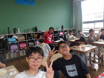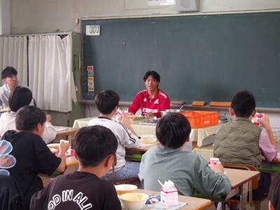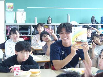 いよいよ4月12日(日)に、2026九州サッカーリーグのホーム戦、FC延岡アガタ対ブリュー佐賀の試合が始まります。現在、2連勝とスタートダッシュで波に乗るFC延岡アガタの選手6名が、本日10日(金)に来校してくれました。放送で「ぜひ、応援に来てください!」と児童に呼びかけ、6年生と一緒に給食を食べてくれました。