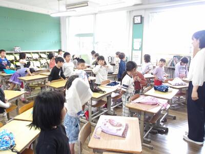 新しいクラス、新しい友達、新しい先生の出会いに、子ども達も先生達も、みんなドキドキわくわくの朝でした。児童代表で歓迎の言葉を述べた6年藤田愛姫さんは、本校目標の「考えて行動」を紹介、新しい先生方と一緒により良い学校を作っていきましょう!と、素晴らしい話をしてくれました。また、生徒指導の伊藤教諭の、先にあいさつと、はいっ!の返事の話に、子ども達はぴりっと気合いが入りました。