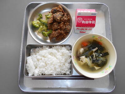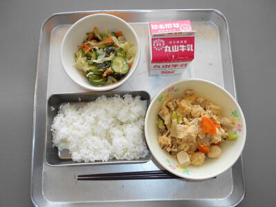 3月18日(月)、献立名(こうやどうふのたまごとじ・わかめのすのもの)今日は、海そうについてのお話です。長生きする人の食べ物を調べてみると海草をたくさん食べていることがわかりました。海そうに 含まれるミネラル(無機質)が働いて血管を丈夫にし、血圧を下げてくれるからだそうです。今日の給食で、酢の物にしている「わかめ」も海藻の仲間です。海藻の仲間は 他には、のり、こんぶ、もずく、ひじきなどがあります。みなさんは、海藻が好きですか?